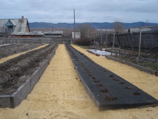 Preto zdvihnutie záhonu 15-25 cm nad cestičku rieši tento problém. Šírka riadku je 60-100 cm, dĺžka ľubovoľná. Cestičky medzi riadkami 60-80 centimetrov.