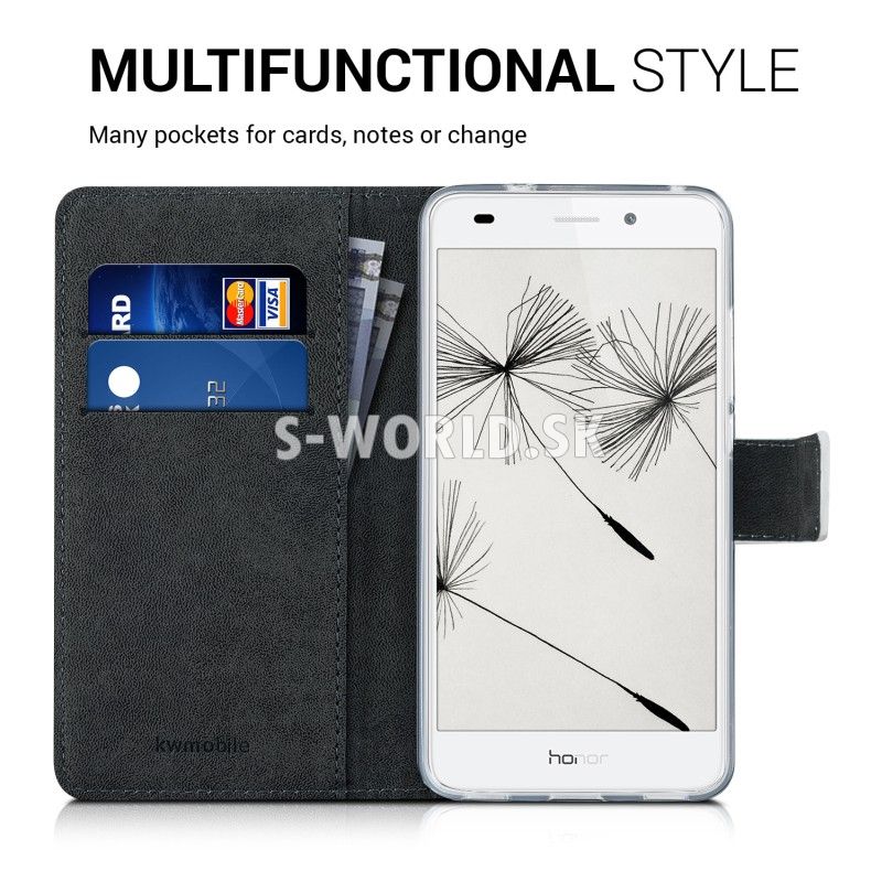 Elegantné kožené puzdro s priehľadnou vnútornou gumenou vaničkou pre Huawei Honor 7 Lite a so záložkami na kreditné karty alebo vizitky.