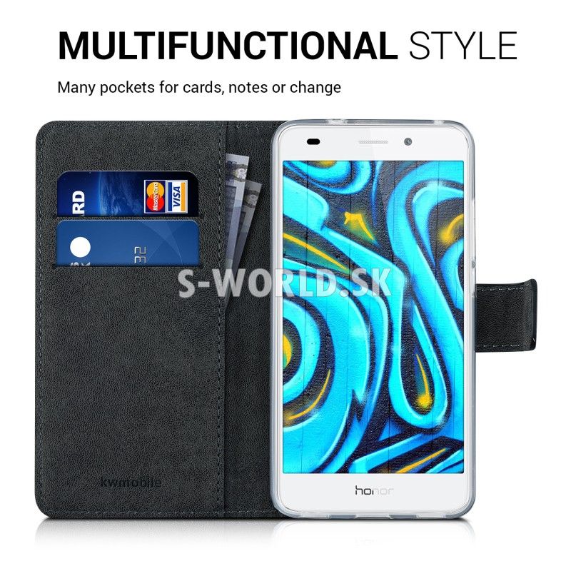 Elegantné kožené puzdro s priehľadnou vnútornou gumenou vaničkou pre Huawei Honor 7 Lite a so záložkami na kreditné karty alebo vizitky.
