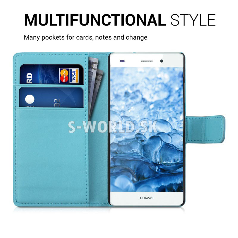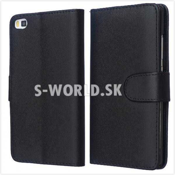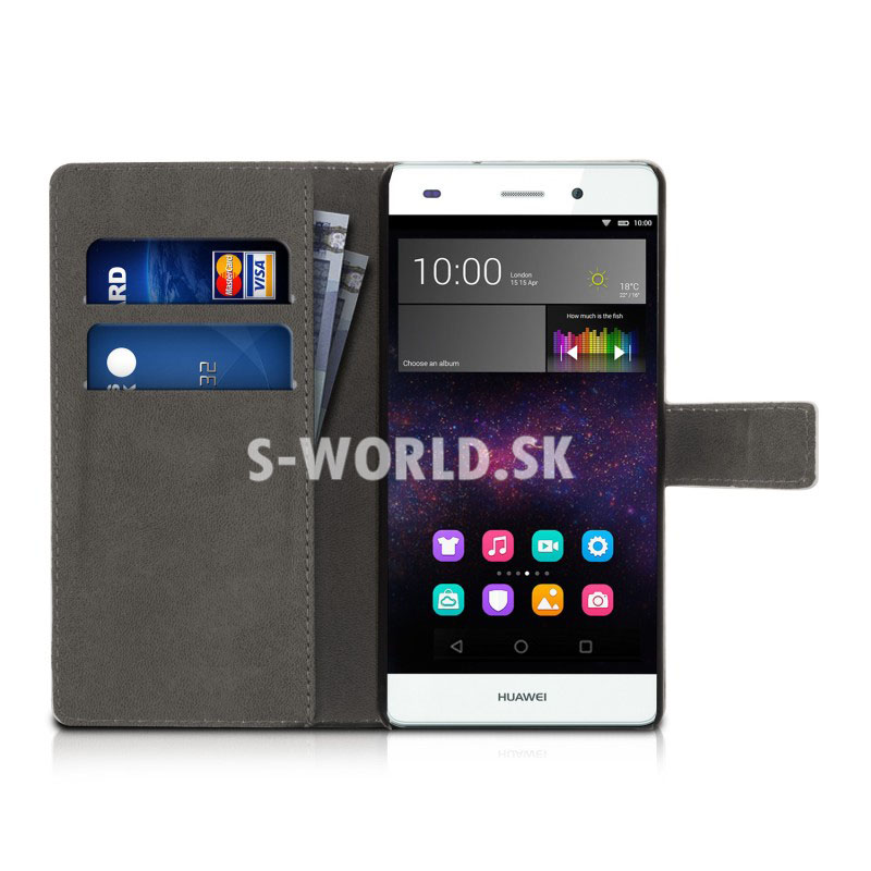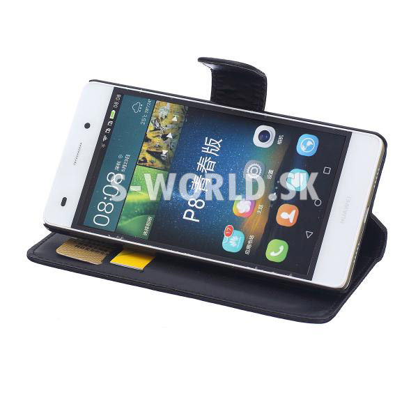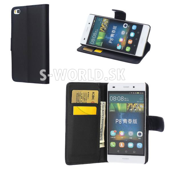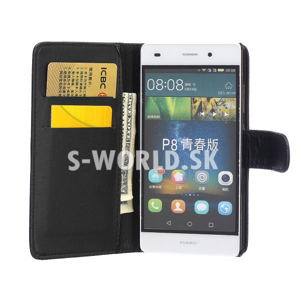 Elegantné kožené puzdro s bočným otváraním pre Huawei P8 Lite so záložkami na kreditné karty alebo vizitky.