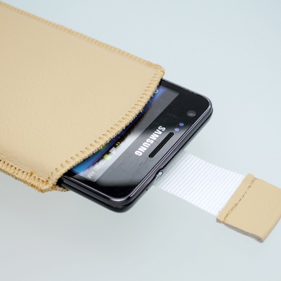 Vsuvka z pravej kože, ručne šitá s vyťahovacím pútkom.