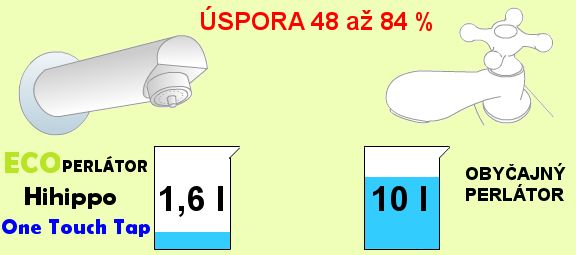 Nenechajte sa zlákať nákupom bežných perlátorov na trhu, ktoré uvádzajú hodnotu úspory vody iba 20 až 40%. Úspora vody u tohto ECO perlátora značky Hihippo je 48 až 84% a ušetrí Vám desiatky (pri vysokej spotrebe aj stovky) eur za vodu, ročne.