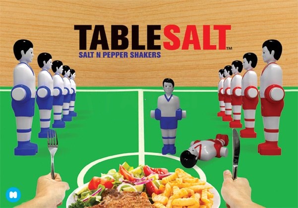 Soľnička a korenička v tvare kalčetových futbalistov. Teraz sa môže začať boj Soľ vs. Korenie. Kto vyhrá?