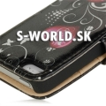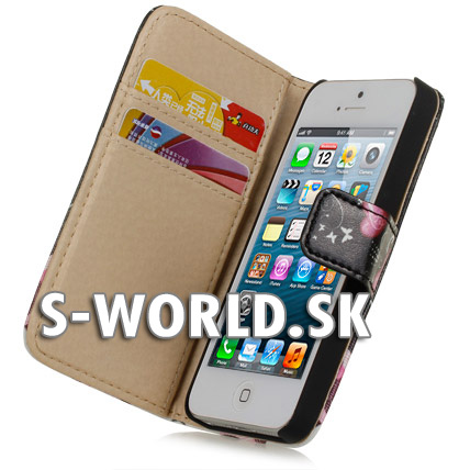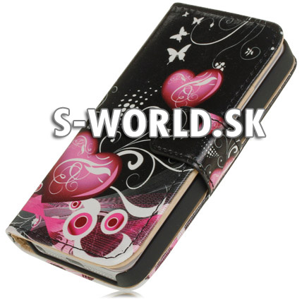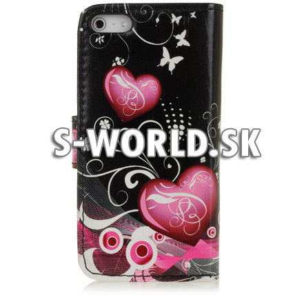 Elegantné kožené púzdro s bočným otváraním pre iPhone 5 so záložkami na kreditné karty alebo vizitky so srdiečkovým motívom.