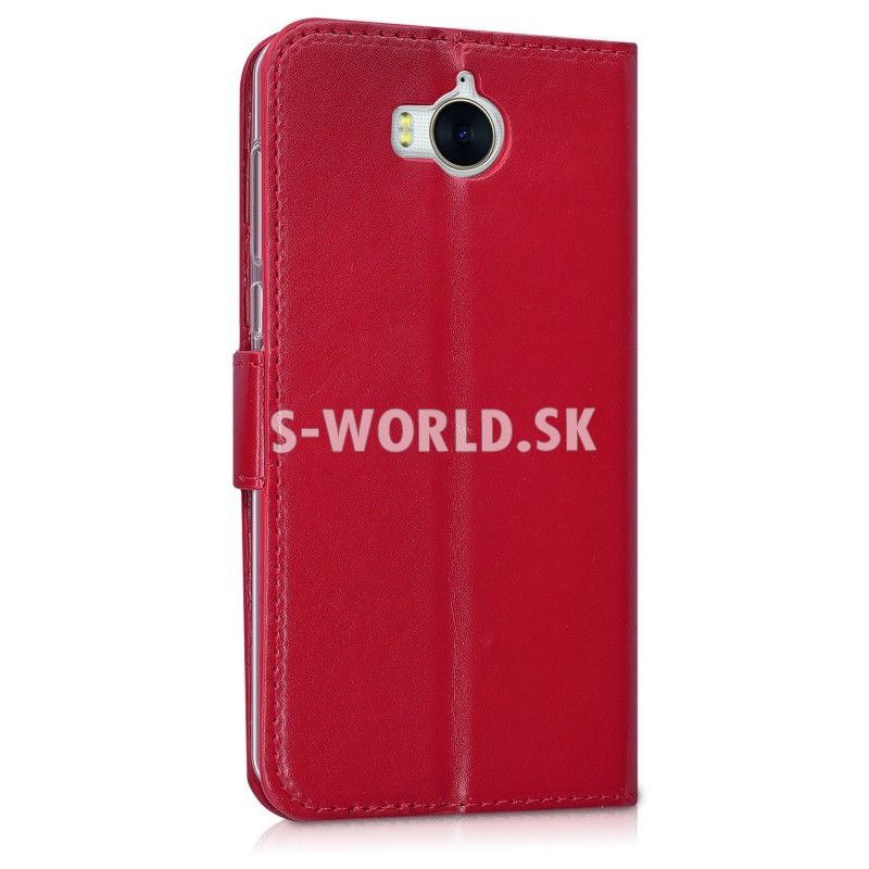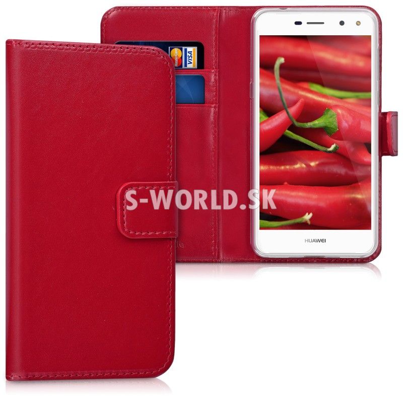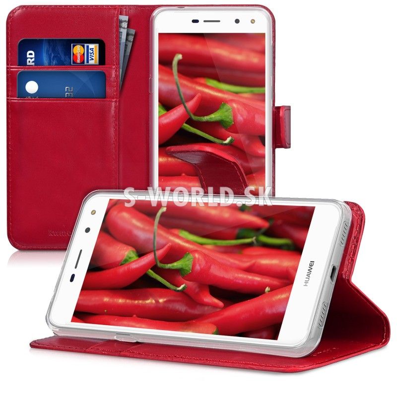 Peňaženkové koženkové puzdro s bočným otváraním pre Huawei Y6 (2017) so záložkami na kreditné karty alebo vizitky.
