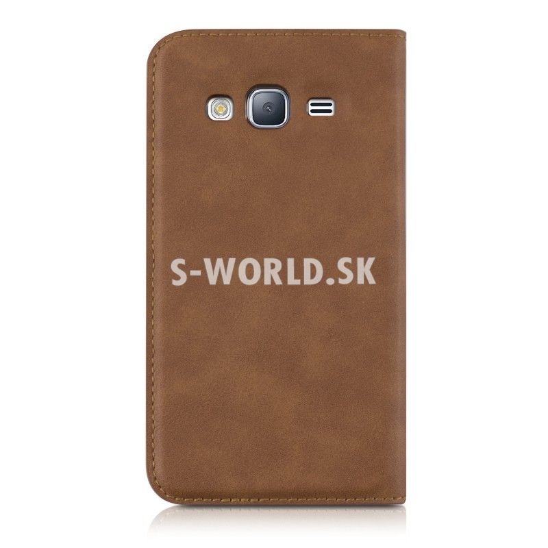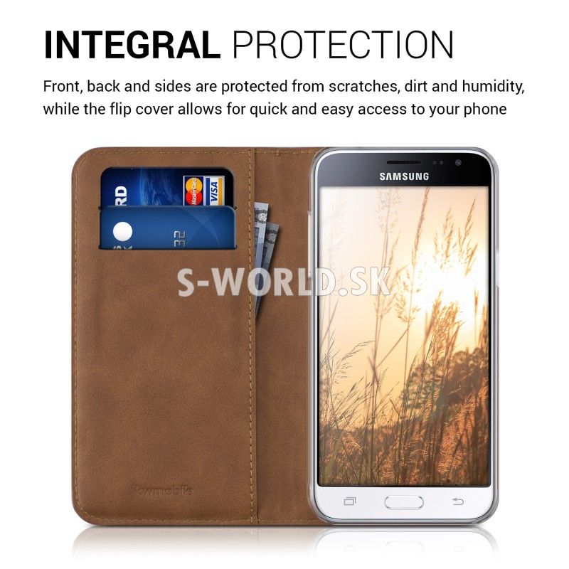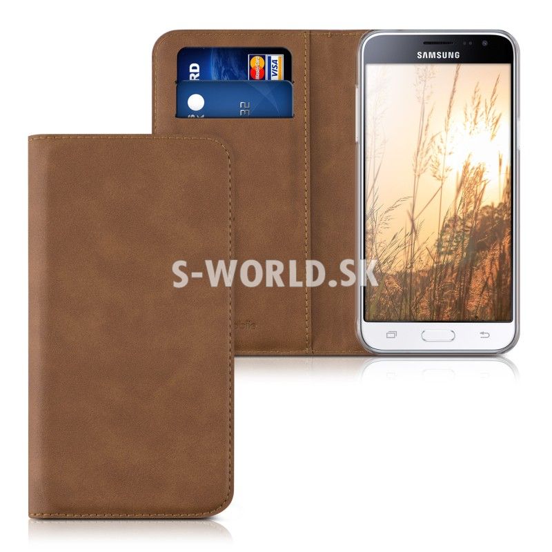 Štíhle peňaženkové puzdro s bočným otváraním pre Samsung Galaxy J3 (2016) so záložkami na kreditné karty alebo vizitky.