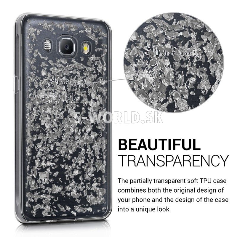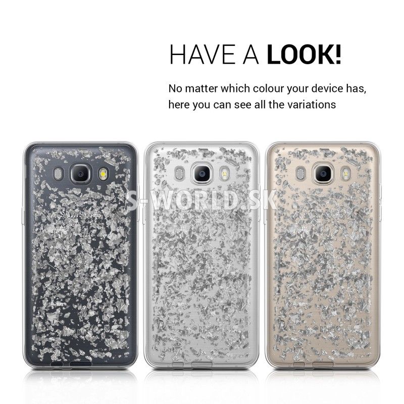 Chráňte svoj štýlový telefón Samsung Galaxy J5 (2016) s vysokokvalitným, proti prachu a proti šmyku odolným priehľadným silikónovým obalom v dizajne s lesklými vločkami na zadnej strane.