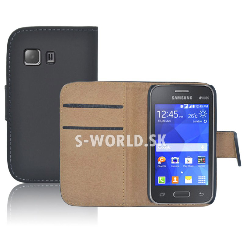 Elegantné kožené puzdro s bočným otváraním pre Samsung Galaxy Young 2 so záložkami na kreditné karty alebo vizitky.