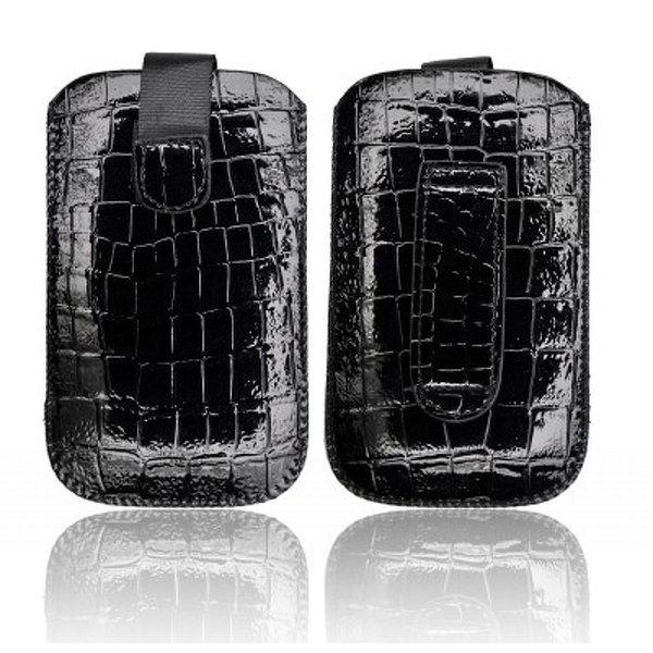 Koženkové púzdro pre mobilné telefóny Samsung Galaxy Young S6310. Uzatváranie suchým zipsom, vyťahovacie pútko, podšívka z mikrovlákna podporujúca samočistenie telefónu pri jeho vyťahovaní / vkladaní, povrch: imitácia krokodílej kože.