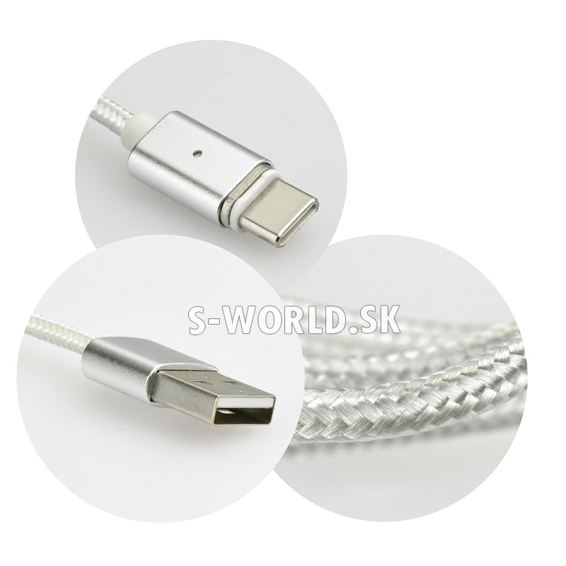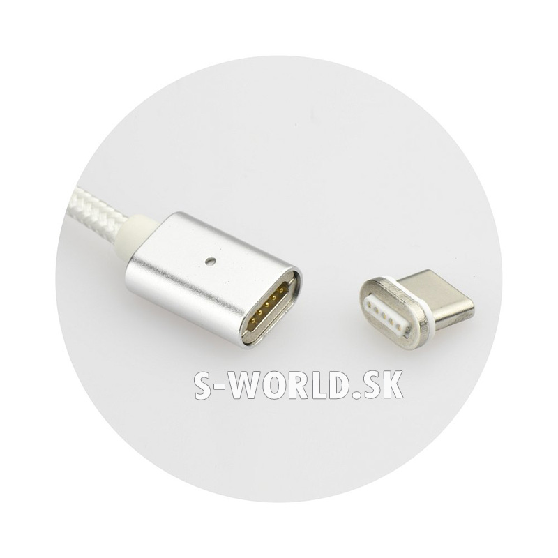 Magnetický USB / USB Typ C kábel. Umožňuje jednoduchú a rýchlu manipuláciu s mobilným telefónom, respektíve jeho pripojenie ku káblu vďaka odpojiteľnej magnetickej koncovke.