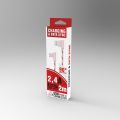 Textilný dátový kábel USB typ C s lomeným konektorom pre pohodlné nabíjanie a prenos dát. Odolný povrch kábla zabraňuje jeho samovoľnému zauzleniu, predlžuje životnosť kábla. Ideálna dĺžka 2 m. Kapacita 2,4A pre rýchle nabíjanie smartfónov.