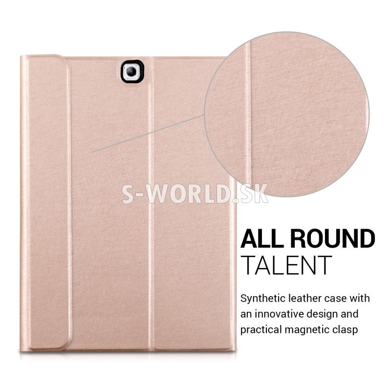 Ochranné puzdro s inovatívnym spôsobom skladania a magnetickým uzatváraním pre Samsung Galaxy Tab S2 9.7 ponúka vynikajúcu ochranu proti otrasom a nárazom. Štýlové puzdro je vyrobené z polyuretánovej kože a poskytuje Vášmu tabletu komplexnú ochranu zatiaľ čo vnútorná časť vyrobená z mikrovlákna poskytuje ochranu pre displej.