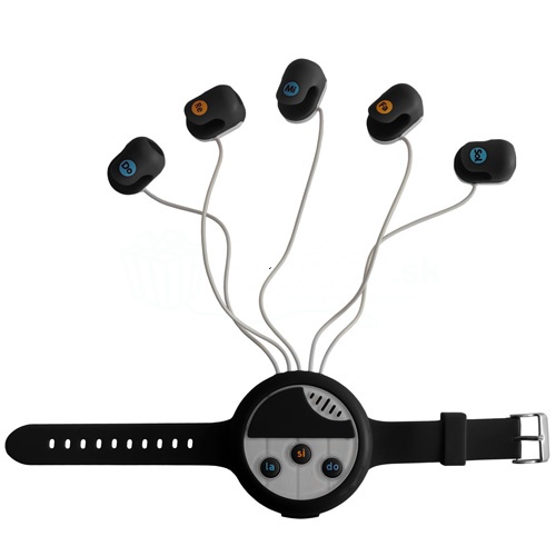 Piano je všetko nádherné, len nie prenosné! Nasaďte si jednoducho zariadenie so zabudovaným reproduktorom na zápästie ako hodiny, umiestnite si jednotlivé tóny na prsty (do, re, mi, fa, sol) v poradí, akom chcete a začnite hrať. Tóny (la, si, do) môžete ovládať druhou rukou na zariadení.