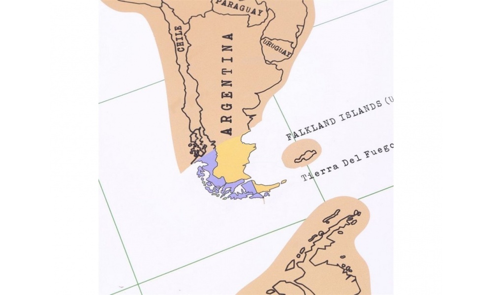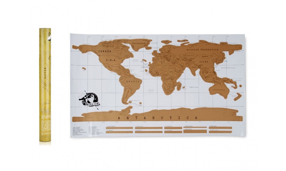 Mapa je vyrobená z dvoch vrstiev. Horná je z fólie, ktorú môžete zoškriabať mincou čím sa odhalí spodná vrstva inej farby a tak bude pekne vidieť, kde ste už boli :)