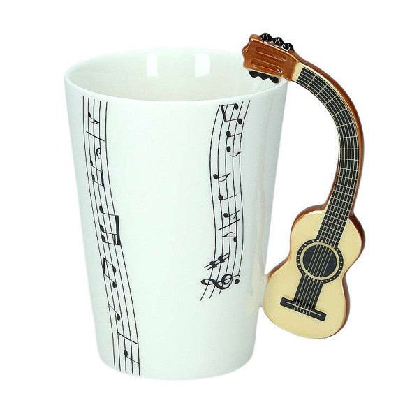 - biely keramický hrnček s rukoväťou v tvare klasickej gitary
