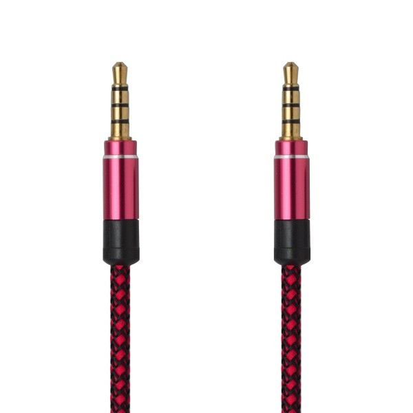 Textilný AUX kábel s audio konektormi 3,5 mm. Užitočný pomocník pre prehrávanie hudby z mobilu alebo tabletu.