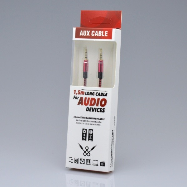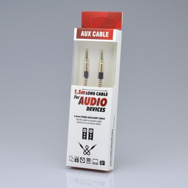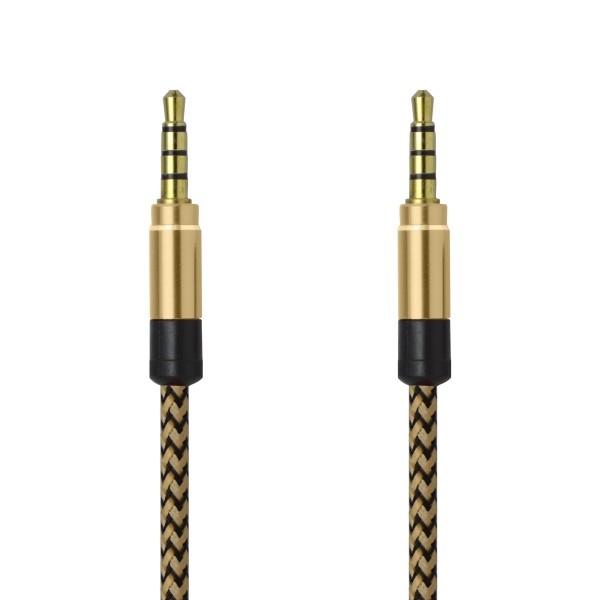 Kábel typu AUX s pozlátenými audio konektormi 3,5 mm. Ideálne riešenie pre prehrávanie hudby z mobilu alebo tabletu.